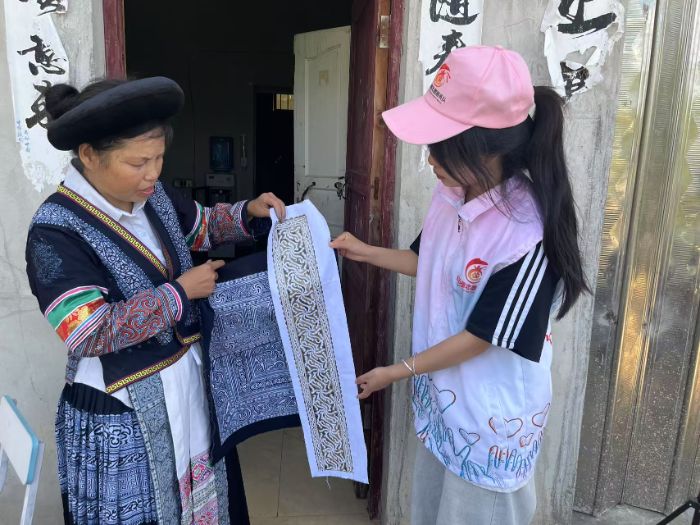 隨后,實踐成員來到營哨村10組15號的農(nóng)舍里,村民鋪開的苗族服飾令人驚嘆:刺繡紋樣取法自然,花鳥蟲魚栩栩如生;扎染色澤如晨霧漸染,自帶山野清趣。“一套嫁衣要耗半年心力,全憑母女相授、婆媳相傳,沒有文字卻從未走樣。”然而這份匠心面臨著現(xiàn)實考驗:盛夏高溫讓沙井鄉(xiāng)的服飾攤位客流銳減,商販午后便收攤歇業(yè);村中青壯年多外出謀生,留守者以手工藝與農(nóng)耕維生,收入微薄。即便如此,每逢趕集、節(jié)慶,村民們?nèi)詴䲟Q上盛裝——那不僅是衣裳,更是“我是苗家人”的身份宣言。
