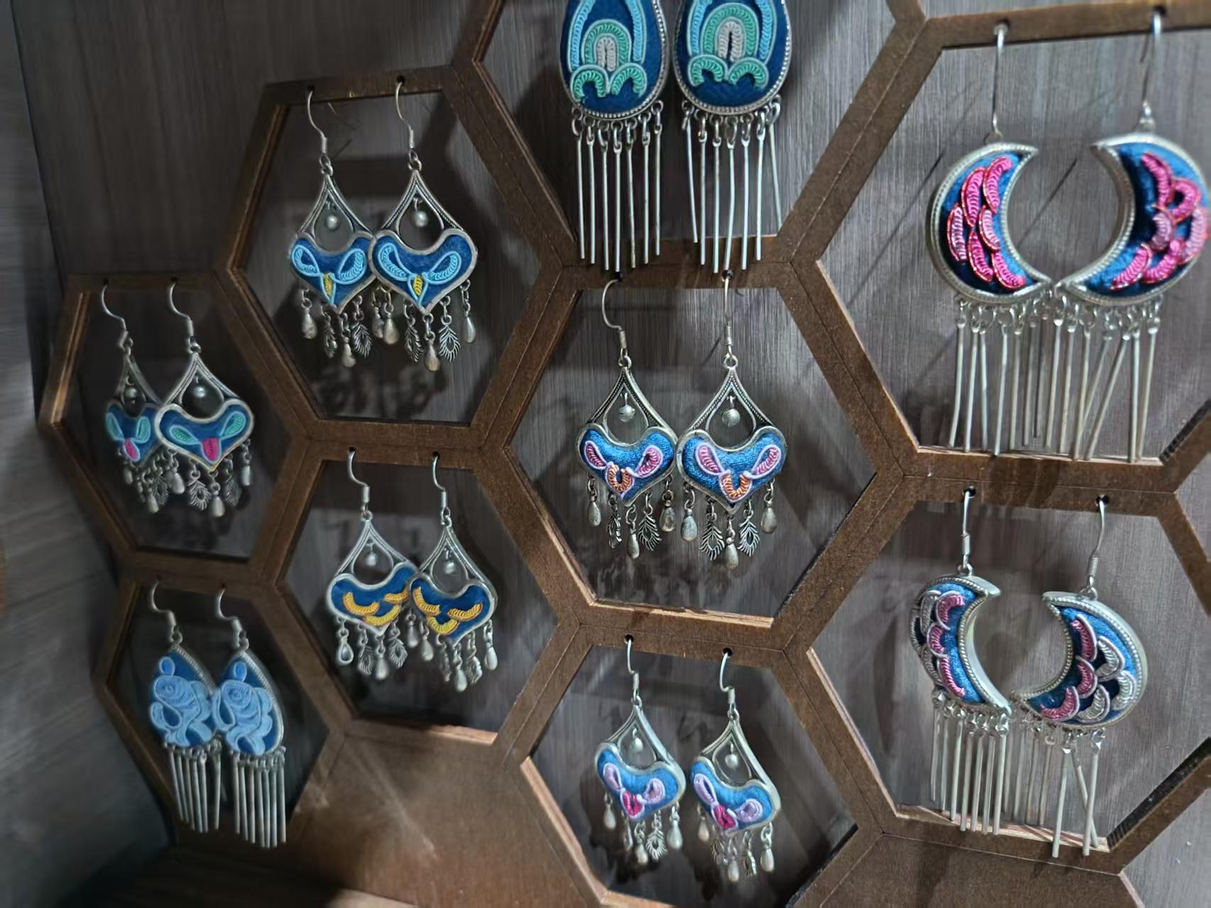 在水族馬尾繡服裝店,實踐團隊和店主韋老師深入交流。韋老師作為一家水族馬尾繡服裝店經(jīng)營者,向志愿團隊介紹了服飾的特殊性。傳統(tǒng)的水族服裝一般以各種綠色、藍(lán)色和棕色等幾個偏暗的顏色為主,到了近現(xiàn)代,融合其他民族文化與現(xiàn)代審美,開始出現(xiàn)粉色和紅色等鮮艷的顏色作為底色的衣服,飾有水族文字、魚紋、蝴蝶紋等,魚紋寓意年年有余,蝴蝶紋象征福運不斷,蝴蝶的諧音是“福”, “吉”、“福”等水族文字刺繡傳遞美好祈愿。隨著時代的發(fā)展,服裝顏色也逐漸變多,不再像以前那樣忌紅、忌黃,常見的顏色也開始出現(xiàn)在大眾眼前。馬尾繡工藝從畫花、馬尾線圍邊到五股線填充,流程精巧,其呈現(xiàn)形式從背帶拓展至帽子、鞋包、首飾,隨時代煥新,成為水族文化“活名片”。繡紙工藝中,蝴蝶圖案借馬尾線、絲線,以特定針法勾勒“福運”,圖案設(shè)計依物品場景靈動變化,盡顯水族獨特刺繡工藝智慧。無論是繡紙工藝中對線條方向的考究,還是馬尾繡在現(xiàn)代設(shè)計中的多樣化應(yīng)用,都體現(xiàn)了傳統(tǒng)技藝與現(xiàn)代審美的完美結(jié)合。這些工藝不僅是文化的載體,更是民族智慧的結(jié)晶。