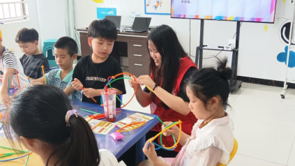 另一邊,9歲的阿澤專注搭建花籃,將吸管彎折、穿插,認真調(diào)整每一根的角度。“老師,花籃能裝小花嗎?”他舉著半成品詢問。隊員點頭鼓勵,“當然!你的花籃可以裝滿創(chuàng)意小花”。阿澤眼睛一亮,用彩紙剪出花朵裝飾,完成后興奮地展示:“這是送給社區(qū)花園的禮物!”孩子們用吸管拼搭出圓球、花籃,還有造型各異的小動物,在互動交流里,把普通材料玩出無限可能。
