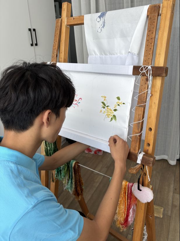 常州亂針繡傳承人孫燕韻老師,金壇刻紙傳承人何雅雯老師,留青竹刻傳承人白雪飛老師并分別在三位大師的工作室中對(duì)其進(jìn)行了專訪,針對(duì)“非遺傳承與數(shù)字化傳播”“守護(hù)傳統(tǒng)與信息化創(chuàng)新”兩個(gè)議題同三位老師展開探討交流,取得了高質(zhì)量采訪成果。在與老師交流學(xué)習(xí)過程中,成員們由表入里,通過觀察老師們的繡法技巧,體會(huì)亂針繡的精妙,并在老師的指導(dǎo)下主動(dòng)嘗試,“實(shí)踐出真知”才能講好非遺故事。