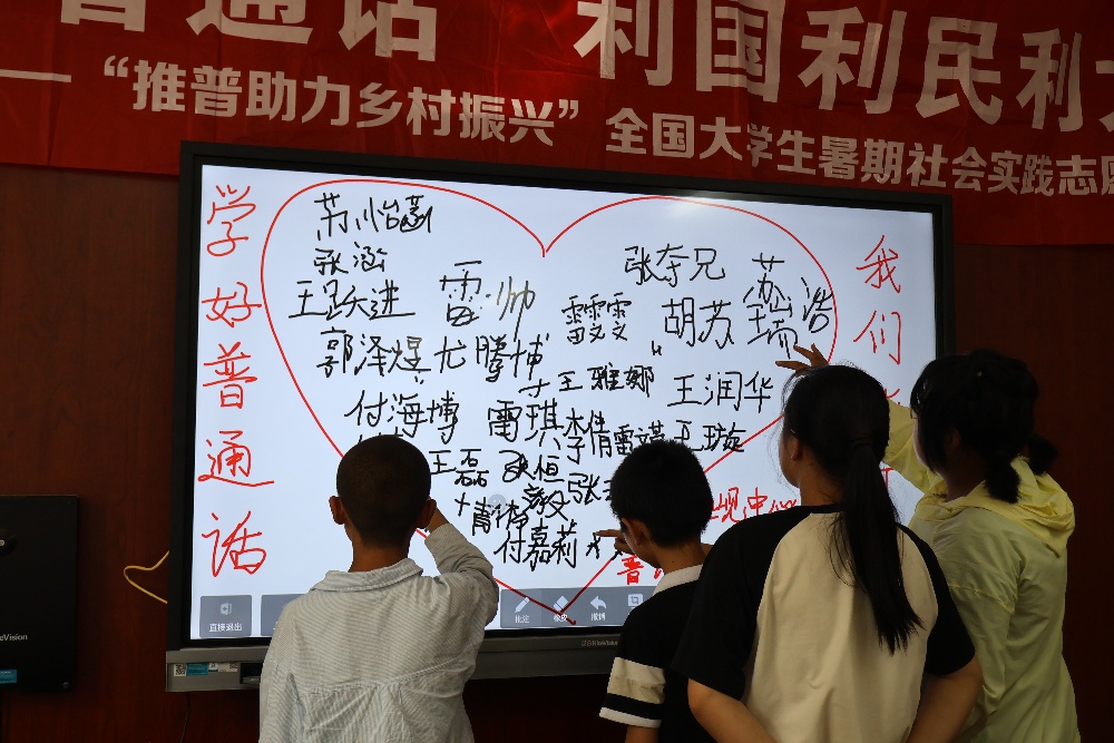 針對不同年級學(xué)生語言能力差異,實踐團以“普通話信心樹立工程”為基礎(chǔ),設(shè)計分層教學(xué)方案;顒右潦迹瑢嵺`團面向全體學(xué)生開展普通話宣傳教育,通過引導(dǎo)學(xué)生分享“說普通話的煩惱”,剖析語言認知偏差,幫助學(xué)生破除“不敢開口”的心理障礙,F(xiàn)場,學(xué)生們在便利貼上寫下學(xué)好普通話的誓言,并在白板“誓言墻”鄭重簽名,用行動立下學(xué)習(xí)承諾,語言表達自信在互動中逐步建立。