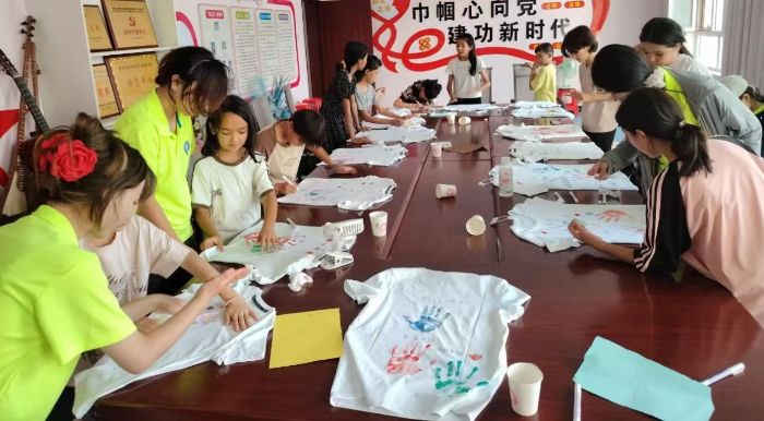 “巧手繪非遺”手工制作活動則將美育與傳統(tǒng)文化傳承相結(jié)合。志愿者們帶領(lǐng)孩子們學(xué)習(xí)體驗當(dāng)?shù)胤沁z項目元素或通用手工技藝,一起用顏料、布料、環(huán)保材料等創(chuàng)作屬于自己的表演服裝和手工作品。照片記錄下了這溫馨的一幕:社區(qū)活動室里,志愿者們和孩子們圍坐在桌前,埋頭創(chuàng)作,交流互動,一幅幅充滿童真想象力的圖案躍然于T恤之上。這不僅鍛煉了孩子們的動手能力和創(chuàng)造力,更增強了他們對民族文化的認(rèn)同感。