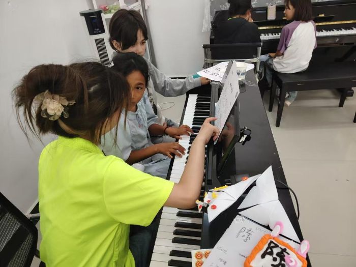 實踐過程中,志愿者們將專業(yè)知識轉(zhuǎn)化為生動有趣的實踐活動。 在“奇妙的琴鍵”鋼琴啟蒙課上,志愿者們從最簡單的音符、指法開始,耐心地一對一指導(dǎo)從未接觸過鋼琴的孩子們。照片中,志愿者俯身在一旁,輕輕握著孩子的手,引導(dǎo)其在鍵盤上按下正確的音符,孩子全神貫注,眼中充滿了對音樂世界的好奇與探索的渴望。短短數(shù)日,一些孩子已能彈奏出《小星星》等簡單旋律,成就感溢于言表。