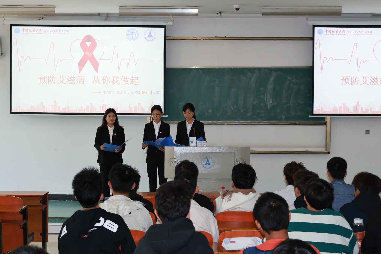 2024年11月5日10點,馬克思主義學(xué)院第十五期紅色之聲“沃原奮蹄”團隊在中南財經(jīng)政法大學(xué)南湖校區(qū)文波211進行了主題為“守護生命,共抗艾滋”及“三牛亦解韶光貴,不等揚鞭自奮蹄”的線下宣講,團隊成員許安琪、王一諾、房柯希擔任主講人。中南財經(jīng)政法大學(xué)公安2401團支部參與本次活動,共計38名同學(xué)。