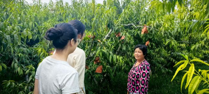 圖 2農民阿姨向團隊成員介紹蒙陰蜜桃