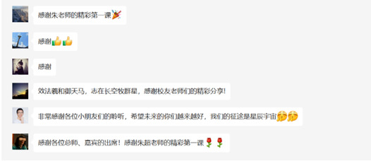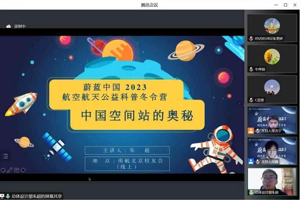 熱烈的互動討論環(huán)節(jié)之后,主持人宣布“蔚藍中國2023”航空航天公益科普冬令營正式開營。隨之而來的是精彩的開營第一課。此次課程有幸邀請到了南航北京校友會杰出校友代表朱超,朱超老師2015年畢業(yè)于南航飛行器設計專業(yè),現就職于航天五院總體設計部,主要負責中國空間站和深空探測空間機械臂總體設計。曾經給中國航天員多次授課,多次接受央視和中國航天報采訪,也與中科院、文昌科普基地、北京雙榆樹小學和人大附中本部一起合作航天科普課程。同學們在課程中收獲滿滿,也獲得了許多啟發(fā),對中國空間站的了解更進一步。同時,本次課程受到家長的廣泛好評與反饋!