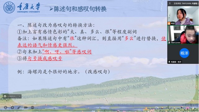 2023年1月14日至1月20日,重慶大學(xué)志愿者楊洋參與了“一起云支教”線(xiàn)上志愿活動(dòng)。在此次公益送教活動(dòng)中,楊洋對(duì)接到了正在上三年級(jí)的譚裕瀚弟弟,楊洋根據(jù)小朋友自身學(xué)習(xí)的弱項(xiàng),精心準(zhǔn)備了“句式轉(zhuǎn)換”、“閱讀理解”“語(yǔ)文寫(xiě)作”三大主題的語(yǔ)文課程,除此之外,還為小朋友講解了“空氣污染”專(zhuān)題的課外趣味科普課程。第一次給弟弟上課時(shí),弟弟活潑開(kāi)朗的性格、積極主動(dòng)的配合都給予了她莫大的勇氣和鼓勵(lì),消除了由于不熟悉而帶來(lái)的緊張感。每一堂課,小朋友都與她積極互動(dòng),用心思考并勇敢回答問(wèn)題,一來(lái)一回的問(wèn)與答讓她和小朋友慢慢熟識(shí)了彼此。