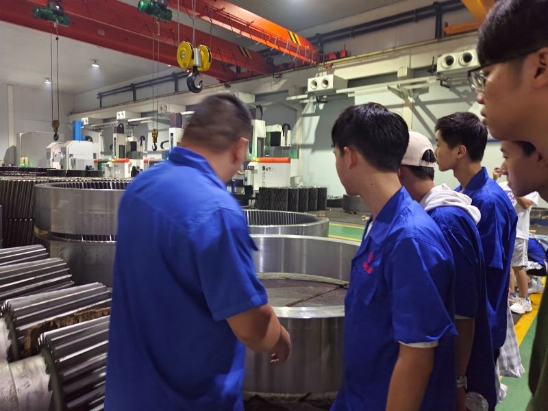 在負(fù)責(zé)人的介紹中我們了解到企業(yè)負(fù)責(zé)齒輪的生產(chǎn),列如大生產(chǎn)器件的齒輪,和風(fēng)力發(fā)電機(jī)上面的齒輪的生產(chǎn)。這整個(gè)過程中,企業(yè)相關(guān)負(fù)責(zé)人帶領(lǐng)隊(duì)員們參觀了各生產(chǎn)車間,并逐一講解其工作的方式和生產(chǎn)的產(chǎn)品。同時(shí)讓我們了解到,一個(gè)齒輪的生產(chǎn)并不是想象中那么簡(jiǎn)單,其工序繁瑣且精密,需要工人們有充足的知識(shí)基礎(chǔ),還需要掌握熟練的操作技能。