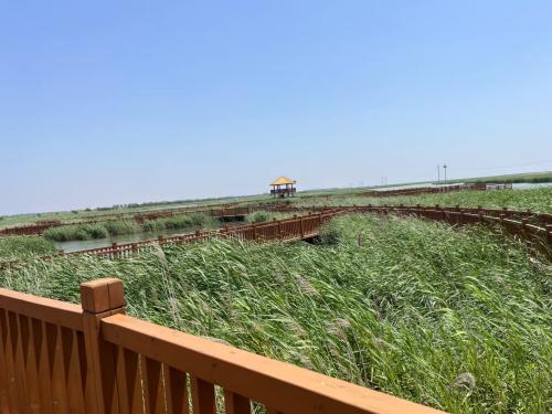 初入景區(qū),廣袤的濕地景觀令人心馳神往,一片云蒸霞蔚,氣象萬千。兩側(cè)是成片連綿的蘆葦,葳蕤蓊郁,處處生機盎然。暖風微醺,天地間流淌著一片青綠,漫步于這水天一色的旖旎風光中,宛如行走在潑墨山水畫中,頗有范仲淹所描繪的“上下天光,一碧萬頃,沙鷗翔集,錦鱗游泳”之感。