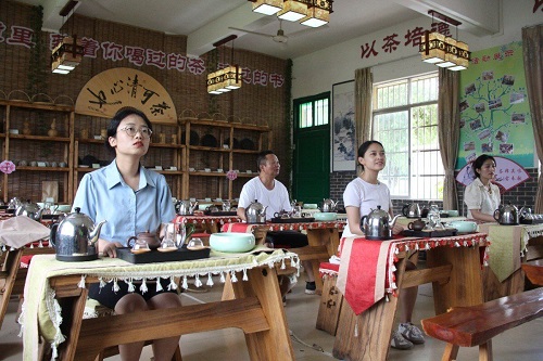 圖2為實(shí)踐團(tuán)成員聆聽茶文化教學(xué)