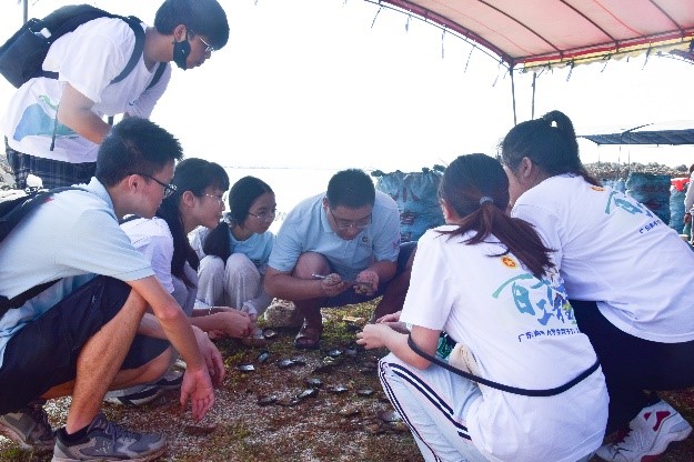 圖4 指導(dǎo)老師楊創(chuàng)業(yè)帶領(lǐng)隊員查看流沙灣外灣育珠情況