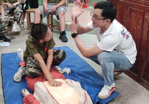 在急救課堂上,隊員采以宣講和實操互動相結合的形式,用通俗易懂的話語、生動的講解以及示范互動,幫助孩子們了解和掌握急救技能。隊員以情景模擬為引,帶領孩子們認識急救的重要性,鼓勵孩子積極思考,同時提供有趣好記的口訣,幫助孩子們掌握和記憶急救步驟,F(xiàn)場還利用模擬假人進行互動示范教學,逐一強調急救動作的要領,指出在操作中容易出現(xiàn)的錯誤動作。通過講原理、抓實踐、重互動的方式,力求幫助青少年真正掌握急救技能。