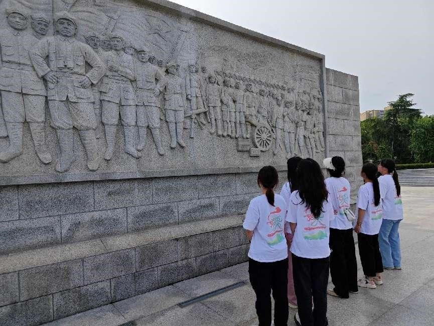 圖為實(shí)踐隊(duì)員在紀(jì)念碑浮雕前合影。 郭曉婷 攝