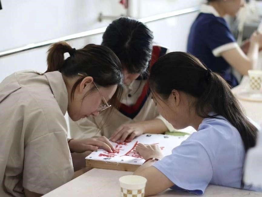 圖為實踐隊員一起制作布貼式樣的學(xué)校大門。 甘樂 供圖