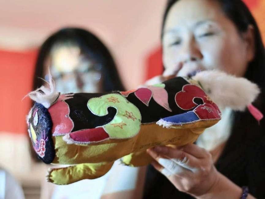 圖為陽新布貼非遺傳承人向?qū)嵺`隊員展示布貼實物——虎頭枕。 甘樂 供圖