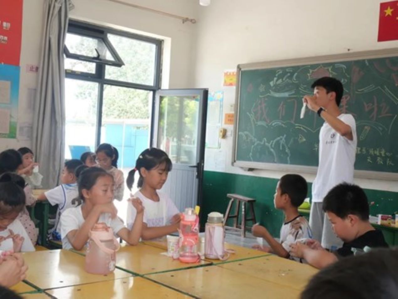 此外,實踐隊員們開設相關理論課程,如“生物基礎科學”“生活中的物理”等課程,介紹生活中常見的物理原理,并向小朋友們解釋生活中神奇的現象,小朋友們全神貫注地聽講,輕松快樂的學習。理論課夯實了小學生的物理知識基礎,激發(fā)他們學習的熱情。