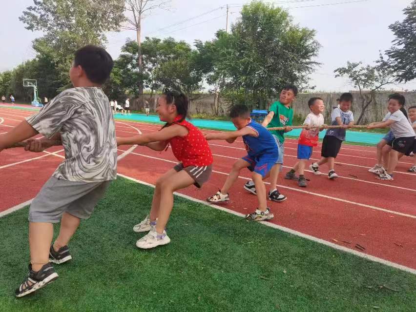 首先,開展的項(xiàng)目是短跑比賽,在“預(yù)備:跑!”一聲令下,孩子們像離弦的箭沖向終點(diǎn),你追我趕,勇爭第一;在休息間隙,六年級(jí)的孩子開始了足球比賽,隨著主裁判的一聲哨響,兩隊(duì)開始了激烈地拼搶,在兩隊(duì)的共同努力下,兩隊(duì)不相上下,都取得了較為優(yōu)異的成績;接著,開展的項(xiàng)目是接力折返跑,孩子們自由組隊(duì),根據(jù)自己的跑步速度自行分配不同節(jié)點(diǎn)的人選,接力跑往往需要考量小隊(duì)伍的團(tuán)結(jié)和配合能力,四個(gè)隊(duì)伍的接力跑速度相差不大,每個(gè)小團(tuán)隊(duì)都在為共同的勝利而團(tuán)結(jié)互助、一起努力;隨后,開展的是“一二三木頭人”和“趣味跳繩”活動(dòng),一二三年級(jí)與四五六年級(jí)分別開展。“一二三,不許動(dòng)!”聽著一聲聲口令,孩子們時(shí)而向前沖,時(shí)而立在原地,歡聲笑語常?M繞在耳畔。哨聲一響,緊張的跳繩比賽拉開了帷幕,每位參賽的學(xué)生都使出渾身解數(shù),超越自我,跳出了自己的好成績。最后,開展的是“拔河”比賽,支教隊(duì)成員將學(xué)生根據(jù)身高體重劃分為兩個(gè)小組,在一聲聲口號(hào)中,每個(gè)孩子都緊緊地拉住繩子,身子往后倒,腳站成弓步,聽到“比賽結(jié)束”的口令,孩子們松開繩子,坐在地上,交談著比賽的所感。