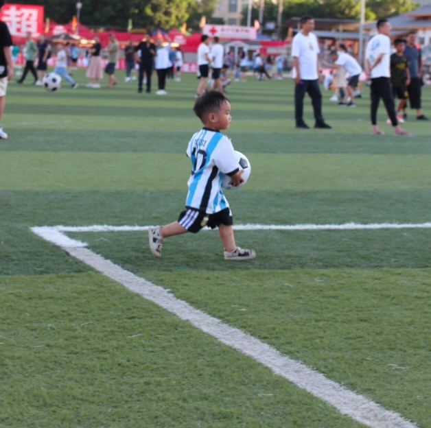 圖為賽前小朋友穿著球衣抱著足球在“村超”球場上盡情奔跑。何智懿 攝