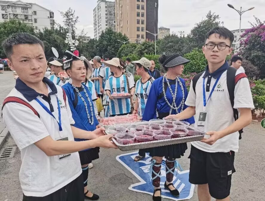 圖為賽前團(tuán)隊隊員參與百塘村啦啦隊加油助威活動期間幫忙端送榕江特色楊梅湯。吳顯維 攝