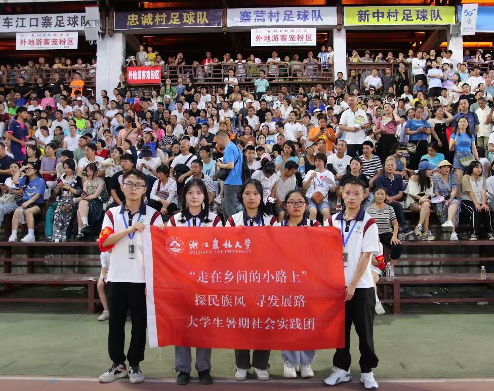 圖為團(tuán)隊在參與志愿者活動期間在“村超”現(xiàn)場人山人海的觀眾席前合影。