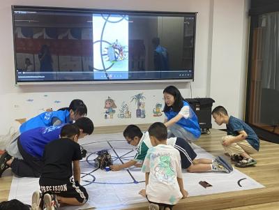 志愿者帶領小朋友們進行循跡小車的拼裝