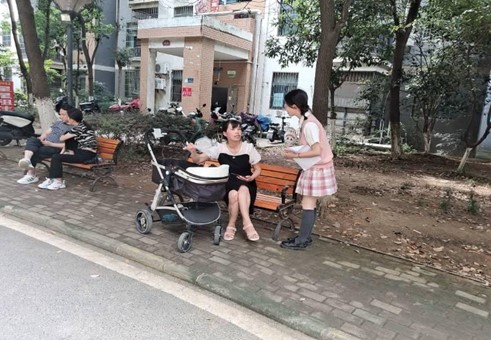 圖為實(shí)踐隊(duì)員在湖口社區(qū)內(nèi)發(fā)放有關(guān)黨史的調(diào)查問(wèn)卷的場(chǎng)景。