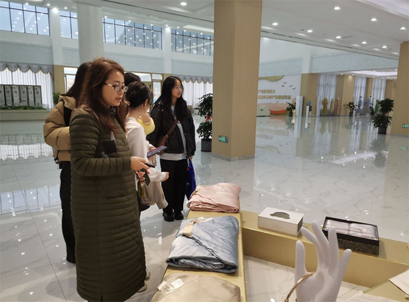 圖為接待人介紹園區(qū)生產蠶絲商品