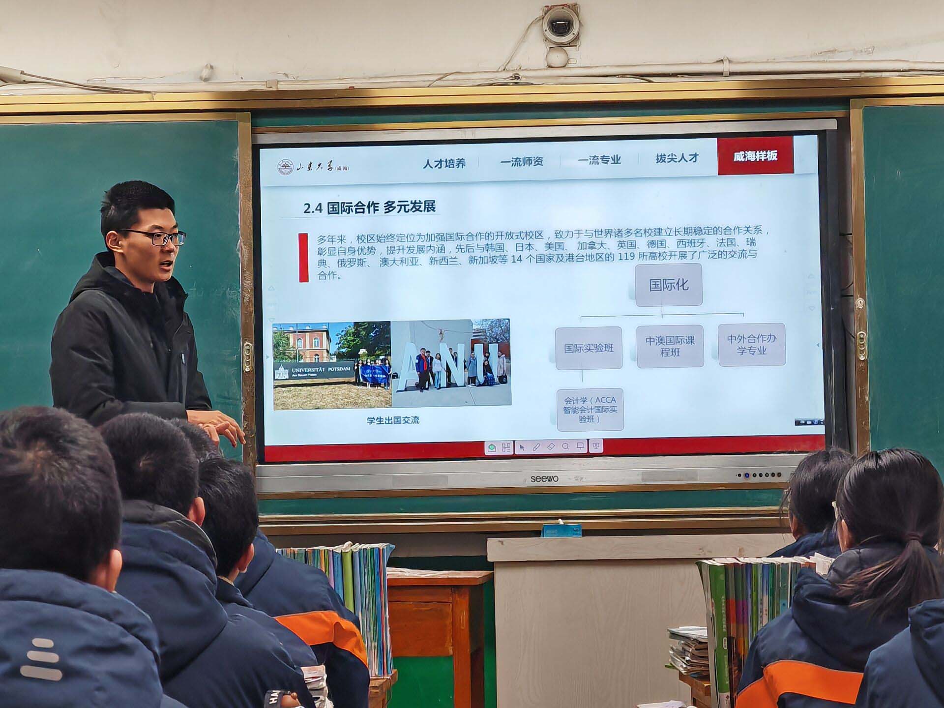 1月26日至2月3日,團(tuán)隊(duì)第一階段的宣講活動(dòng)正式展開(kāi)。宣講團(tuán)成員李昊雷首先前往了東平高級(jí)中學(xué)進(jìn)行回訪宣講,重點(diǎn)向同學(xué)們介紹山東大學(xué)(威海)的學(xué)校概況、資源配置、學(xué)科建設(shè)、人才培養(yǎng)等多方面內(nèi)容。通過(guò)對(duì)往年招生數(shù)據(jù)的展示分析,李昊雷為同學(xué)們解答了本科招生的相關(guān)事項(xiàng),逐一回答了學(xué)生關(guān)于升學(xué)相關(guān)的疑惑。
