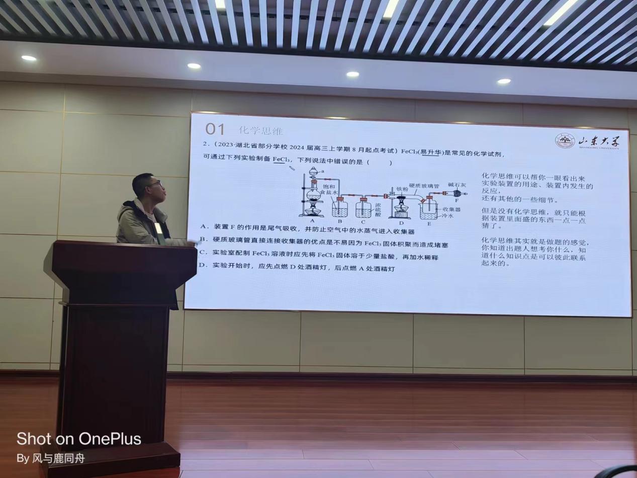 陳虹宇著重講解了化學(xué)思維和做筆記習(xí)慣兩個(gè)方面。在講解化學(xué)思維的時(shí)候,老師以一道模擬實(shí)驗(yàn)題為例,詳細(xì)講解了通過聯(lián)想和想象解決問題的化學(xué)思維。每一個(gè)裝置、每一個(gè)方程式,并非孤立,而是環(huán)環(huán)相扣如鎖鏈一般,表面上只有兩種物質(zhì)反應(yīng),但只有深究反應(yīng)條件和反應(yīng)物的變化,才會得到真正的答案。