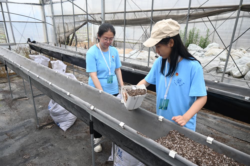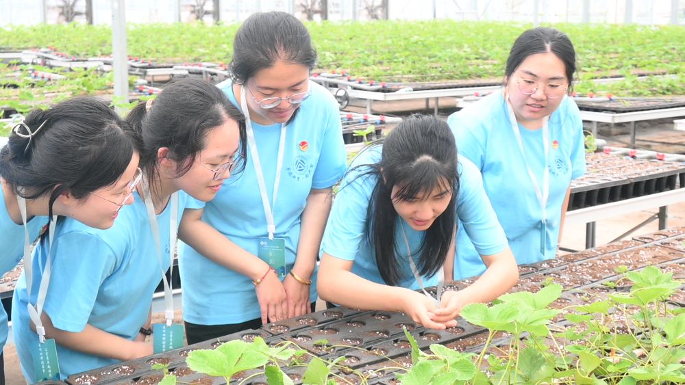圖為實踐團成員觀察玉蘭果蔬農(nóng)場的幼苗栽培