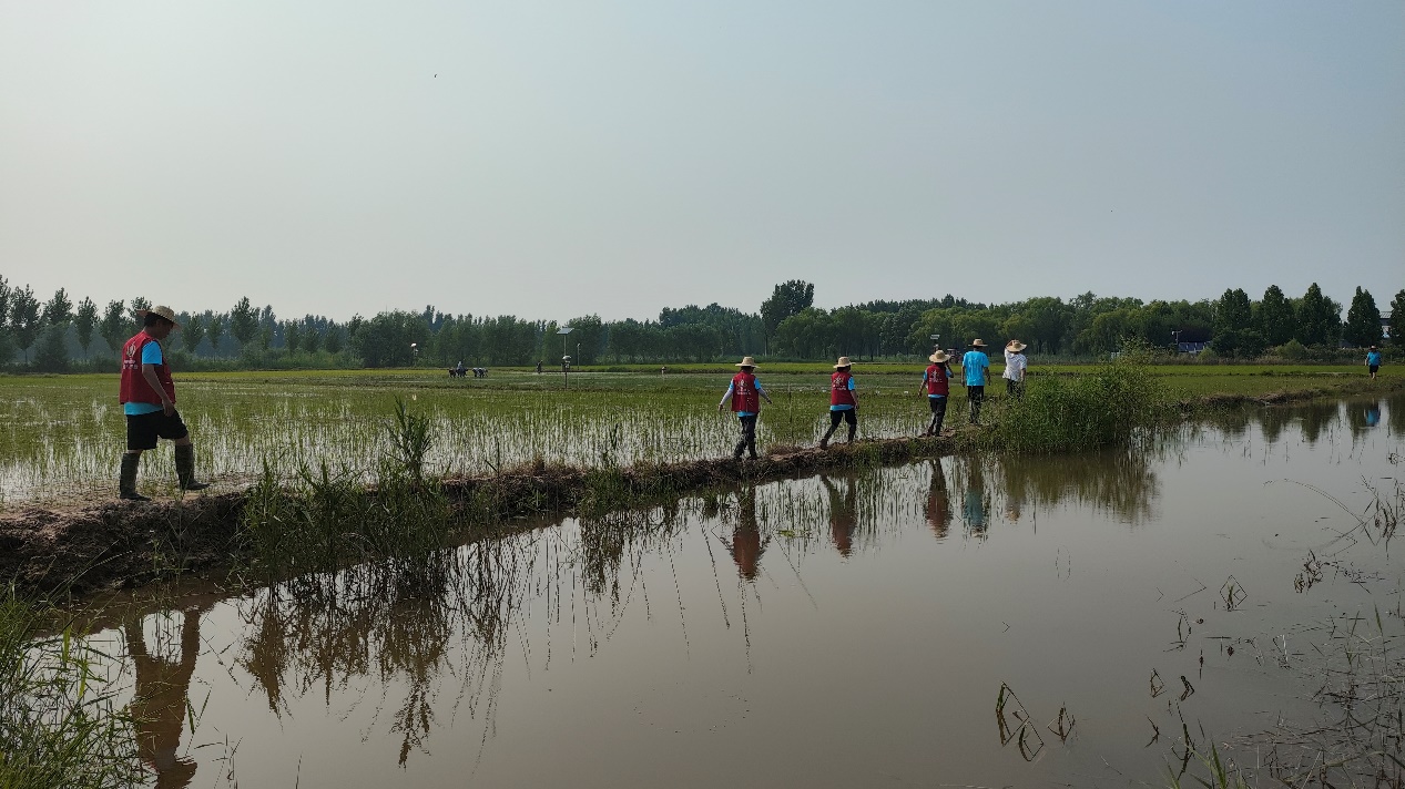 圖為水稻種植負(fù)責(zé)人領(lǐng)硅小蒜實(shí)踐團(tuán)成員前往水稻育種基地進(jìn)行水稻種植的學(xué)習(xí)