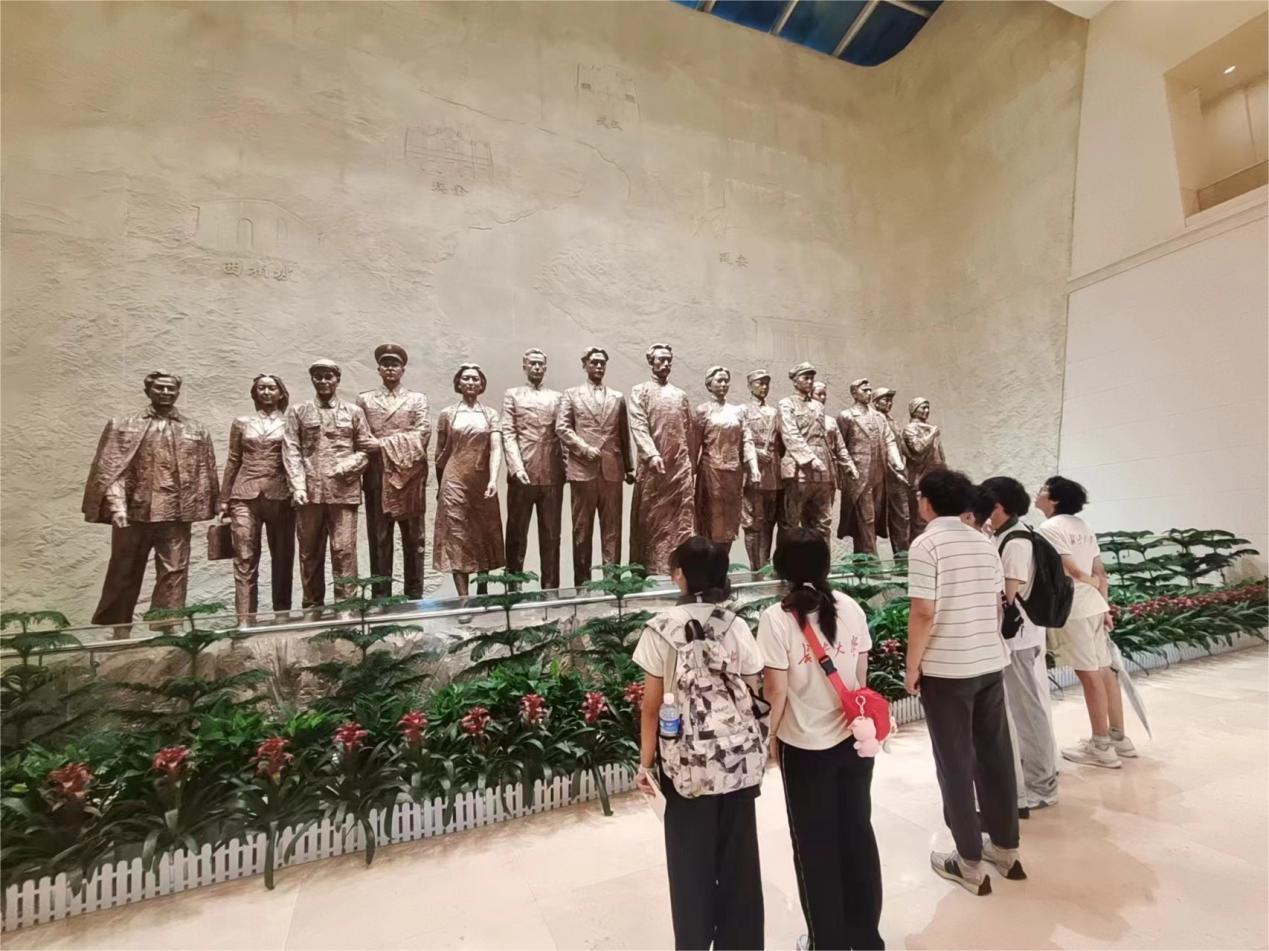 之后,實踐隊來到了中國共產黨紀律建設歷史陳列展覽館。步入其中,首先映入眼簾的是一座雄偉的雕塑。雕塑中,十五位革命先驅們姿態(tài)各異,有的手持公文包,有的懷抱糧袋,有的揮舞著革命的旗幟。他們的眼神堅定,目光如炬,仿佛能穿透歷史的塵埃,直視那即將到來的黎明。順著他們的目光望去,仿若能看到一片廣闊的田野,那是革命勝利后的豐收與希望。這些先驅們用他們的汗水和智慧,在武漢這片土地上繪制出了革命的藍圖,用他們的堅韌和勇氣,鋪就了通往自由與平等的康莊大道。他們的偉大,不僅在于他們所成就的事業(yè),更在于他們用平凡的身軀,書寫了不凡的歷史篇章。