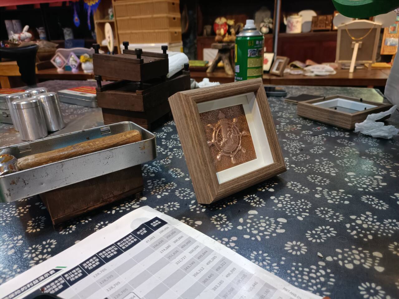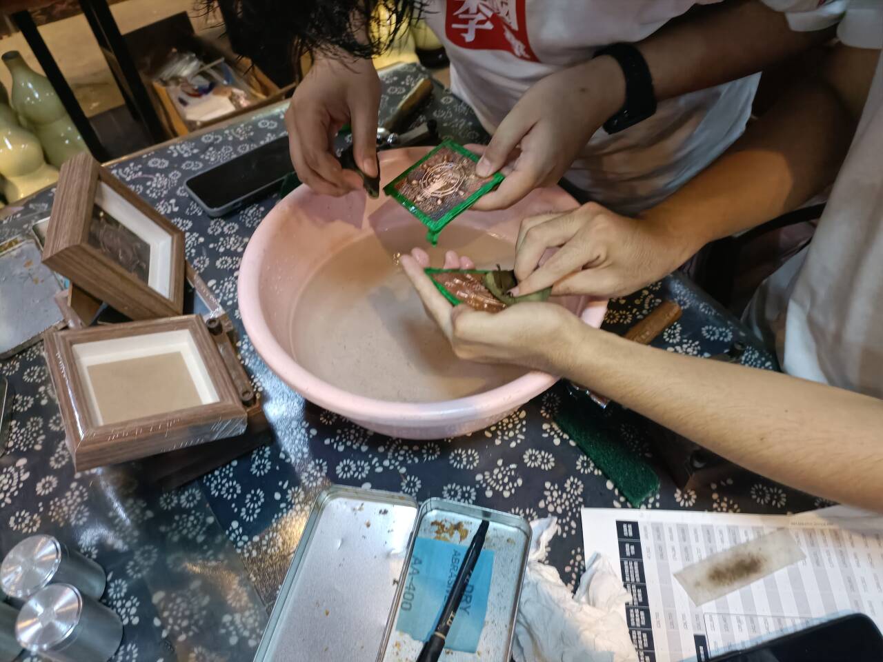 團(tuán)隊(duì)成員親自體驗(yàn)了銅版畫的制作過程。首先是準(zhǔn)備銅版,這一過程需要精確地打磨和拋光,使得銅版表面達(dá)到理想的平整度。然后,使用膠帶將銅板固定在鐵砧上,并用錘子墊在膠條上捶打。這一步驟的精度和技巧性十分具有挑戰(zhàn)性,每一次捶打都需要細(xì)致入微的控制力和對(duì)藝術(shù)的把控度。接下來(lái)是拋光環(huán)節(jié),團(tuán)隊(duì)成員學(xué)習(xí)了如何在銅版上進(jìn)行拋光,并在銅板上打蠟。每一次拋光都要求準(zhǔn)確的力度和一定的耐心,以確保最終做出高質(zhì)量的作品。