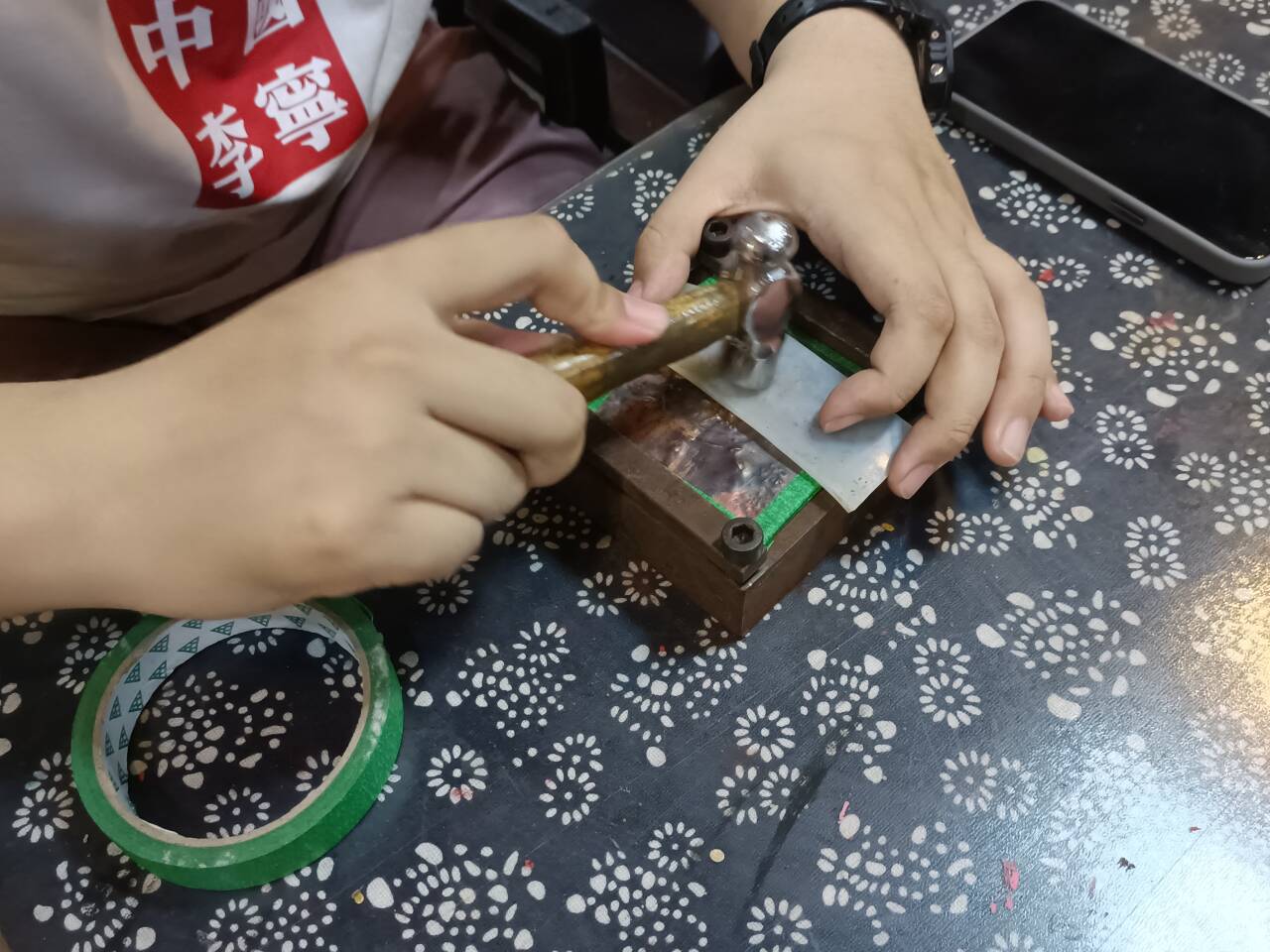 圖為團(tuán)隊(duì)成員在敲打銅板,進(jìn)行制作