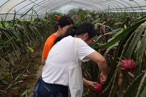 隨后,在曾強先生的帶領下,實踐團成員深入田間地頭,親眼見證了火龍果從枝頭到籃中的奇妙轉變。成熟的火龍果掛滿枝頭,色澤鮮艷、果實飽滿,散發(fā)著誘人的香甜氣息。大家紛紛動手參與采摘,體驗了農(nóng)耕文化的樂趣與艱辛,同時也更加直觀地感受到了現(xiàn)代農(nóng)業(yè)科技的魅力。