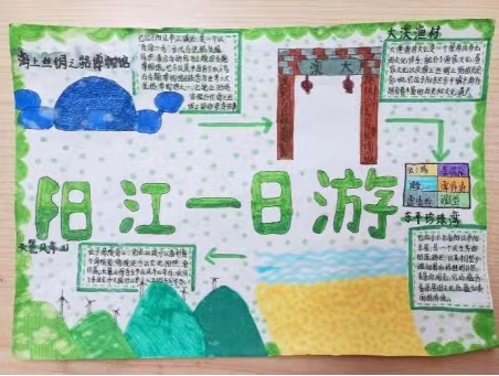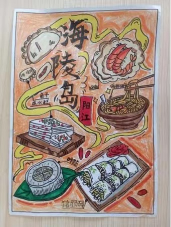 在所有學生展示的作品中,既包括采用一類資源為主題以集中體現(xiàn)陽江特色文化的形式,也有囊括各種景點以展示陽江豐富文旅資源的作品。內(nèi)容選擇上,既有豬腸碌、咸水糕等陽江特色美食,也有海陵島、東平大澳漁村、珍珠灣等海洋旅游資源,更有漆藝、風箏等非遺技藝。多種多樣的作品百花齊放,利于從多個角度詮釋對于家鄉(xiāng)文化的理解,展現(xiàn)陽江這座城市的魅力。