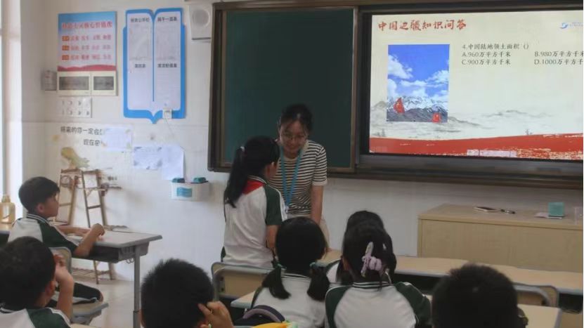 在紅色邊防講解課堂中,孫樂以國家地理知識(shí)導(dǎo)入課堂。從國土面積到中國海岸線全長,學(xué)生們開動(dòng)腦筋,舉起手來積極與教師搶答,展現(xiàn)了學(xué)生們豐富的知識(shí)儲(chǔ)備。