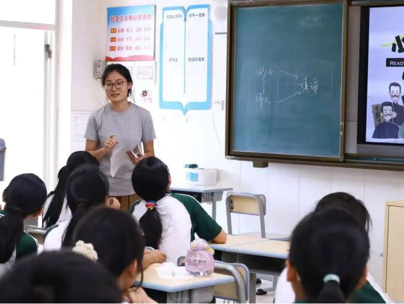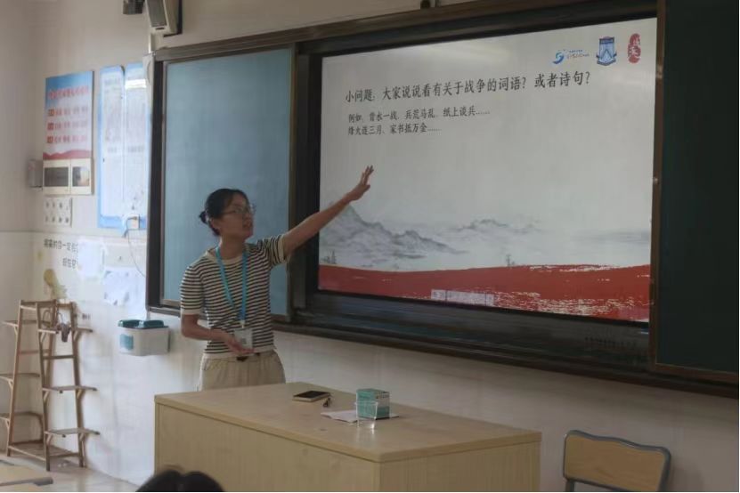 在紅色家書講解課堂,羅镕怡圍繞“紅色”“家書”等關(guān)鍵詞向?qū)W生提問,鼓勵(lì)學(xué)生分享自己理解中的“紅色家書”。她先從時(shí)代背景出發(fā),向?qū)W生展示紅色家書產(chǎn)生的歷史原因。經(jīng)過之前紅色歷史的學(xué)習(xí),學(xué)生們對(duì)于紅色家書的理解更加深刻與準(zhǔn)確,積極回答老師的問題。