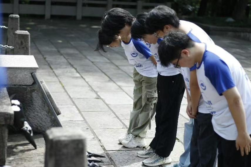 圖為團(tuán)隊(duì)成員向烈士之墓鞠躬 黃睿潔 攝