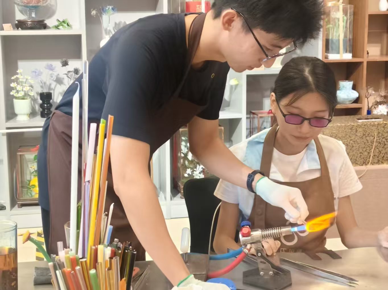 在琉璃手工匠人指導下,大家親手制作琉璃葫蘆:高溫熔料后,一轉一燒定形,再經拉拽、捏把、冷卻、穿繩,一個個小巧吊墜便完成了。高溫下的琉璃如“火焰精靈”,讓人直觀體會到傳統(tǒng)手藝的奇妙。
