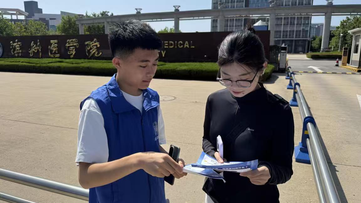 (圖為實(shí)踐隊(duì)成員向?yàn)I州醫(yī)學(xué)院同學(xué)科普AI防詐知識 “法盾防詐”實(shí)踐隊(duì) 王一諾 供圖)