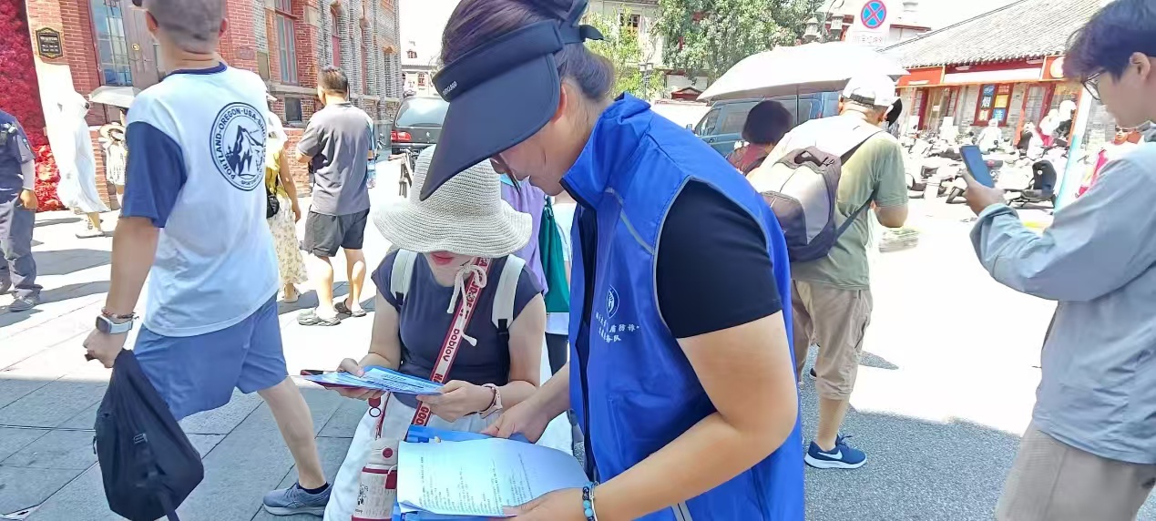 (圖為實踐隊成員在煙臺山為游客普及AI詐騙 “法盾防詐”實踐隊 張藝 供圖)