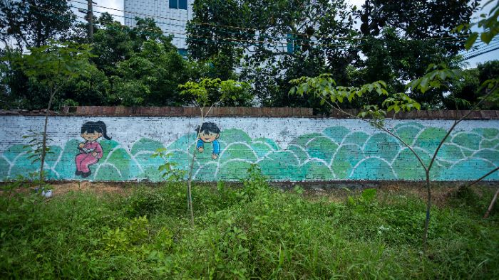 熱浪蒸騰的第七天,臺風(fēng)裹挾暴雨突襲!雨水如瀑沖淡剛上墻的橘紅,隊員們沖進雨幕,用身體筑起人墻守護畫作——