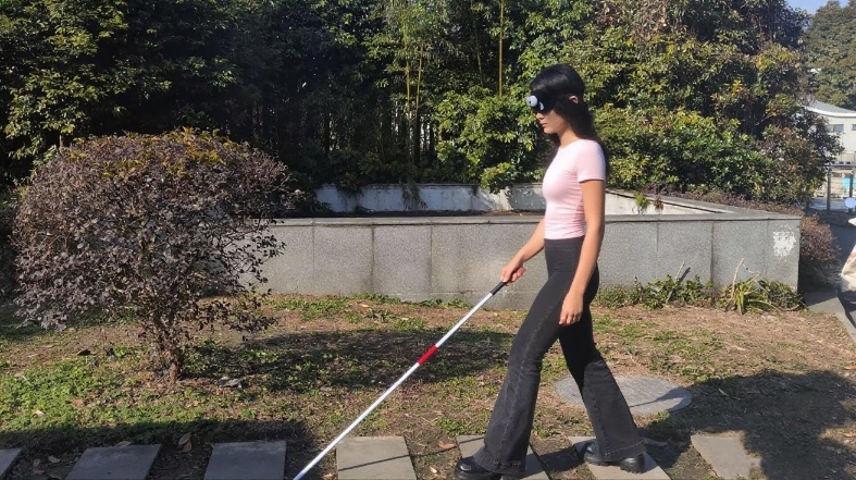 “紙上得來終覺淺”,為盡可能真實地模擬視障人士日常出行狀況,團(tuán)隊成員們戴上眼罩,手持盲杖,沿著清掃干凈的盲道行走。團(tuán)隊成員依靠盲杖敲擊路面發(fā)出的聲音分辨盲道方向,但由于周圍嘈雜的環(huán)境和盲道的不平整帶來的巨大干擾,體驗時頻繁出現(xiàn)偏離盲道路線、碰撞障礙物的情況,這更加堅定了成員幫助視障群體改善出行環(huán)境的決心。
