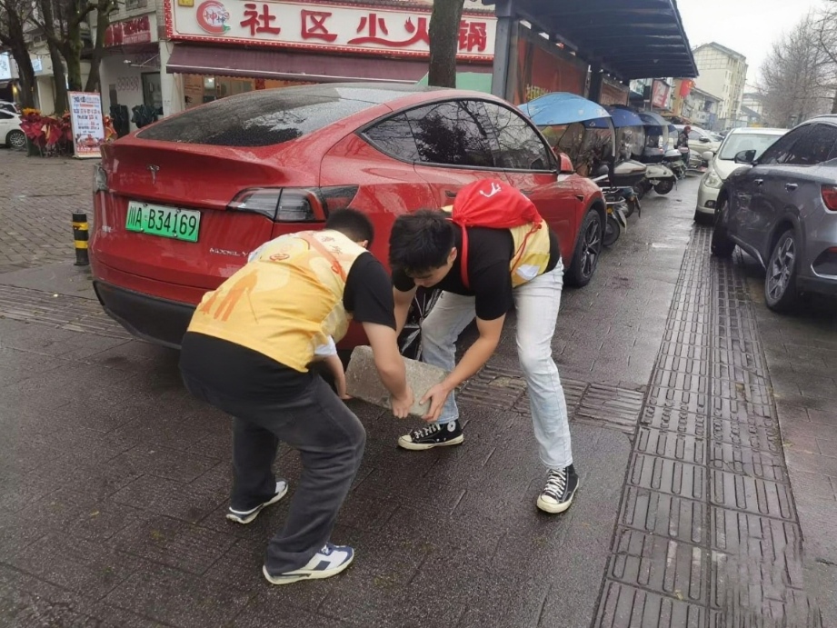 ▲圖為團(tuán)隊成員清理盲道 胡可攝