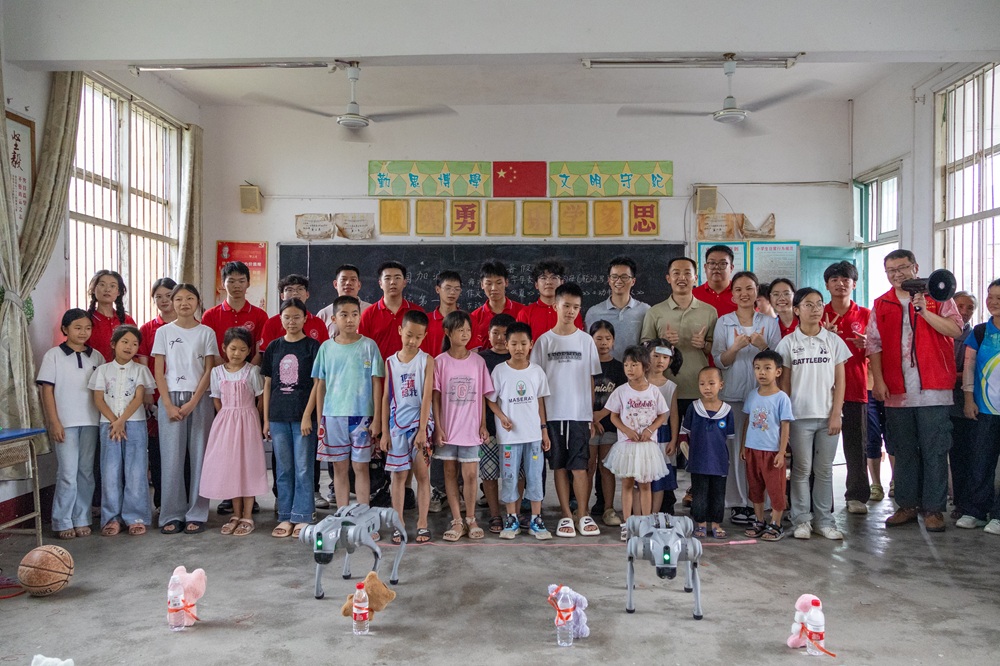 離開面條廠房,實踐隊來到東陽村小學(xué)。在開展積木拼裝活動前,隊員們特意帶來了機(jī)器狗表演,瞬間點燃了孩子們的熱情。機(jī)器狗隨著指令做出前進(jìn)、跳躍、跳舞等動作,靈活的身姿引得孩子們陣陣歡呼。這場充滿科技感的表演,讓孩子們近距離感受到了科技的魅力。
