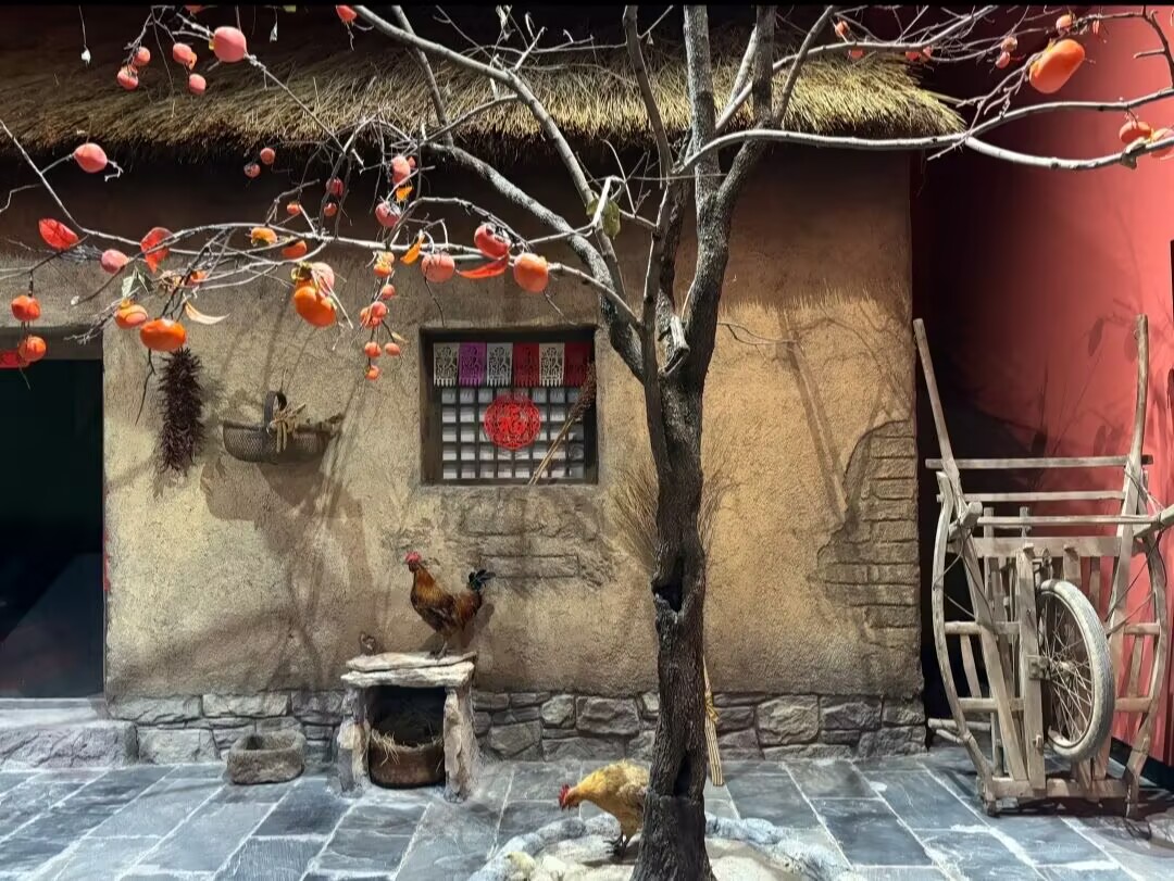 而在博物館的另一處角落,展現(xiàn)的是一幅充滿生活氣息的庭院場景,一棵光禿禿的樹枝上掛滿了紅彤彤的柿子和一串串紅辣椒,這獨(dú)特的裝飾方式讓人眼前一亮。柿子寓意著“事事如意”,紅辣椒象征著紅紅火火,兩者結(jié)合,表達(dá)了人們對生活的美好期盼。樹下,幾只栩栩如生的雞正在覓食,旁邊的石磨和手推車仿佛在訴說著過去人們辛勤勞作的故事。墻上的窗花和福字與屋內(nèi)場景相呼應(yīng),而那輛老舊的手推車則讓人聯(lián)想到過去人們在春節(jié)前忙碌地準(zhǔn)備年貨,走親訪友的熱鬧場景。這些看似平凡的物品和場景,卻蘊(yùn)含著深厚的春節(jié)民俗文化,它們是歷史的見證,是傳統(tǒng)文化的傳承。