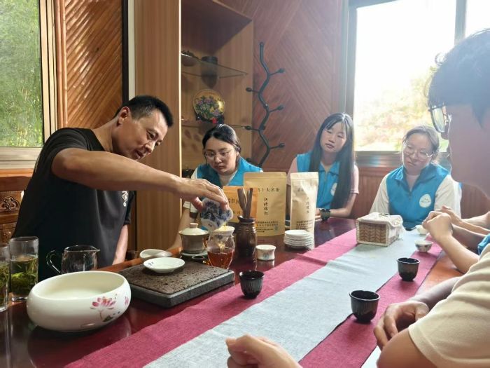 后續(xù)我們進(jìn)行了除草、品茶等方面的學(xué)習(xí),尹經(jīng)理詳細(xì)的教給了我們品茶相關(guān)的內(nèi)容。從“茶湯有氣泡,往往回甘更佳。”,到優(yōu)質(zhì)紅茶“一泡一味”,第三、四泡滋味最是醇和飽滿(mǎn)。倒茶時(shí),他展示的“三龍護(hù)鼎”手法穩(wěn)健優(yōu)雅,同時(shí)他也為實(shí)踐團(tuán)成員講解了“壺嘴不對(duì)客”、三指敲桌三下表感謝等禮儀細(xì)節(jié),其彰顯了茶文化中的尊重之道。“茶半酒滿(mǎn)”的規(guī)矩更是暗藏處世哲學(xué)——茶滿(mǎn)則溢,正如做人當(dāng)謙虛有度。成員們舉杯細(xì)品,從舌尖的甘醇到喉間的回甘,再到茶湯色澤的微妙變化,在“一葉一世界”中讀懂茶葉的品質(zhì)密碼。