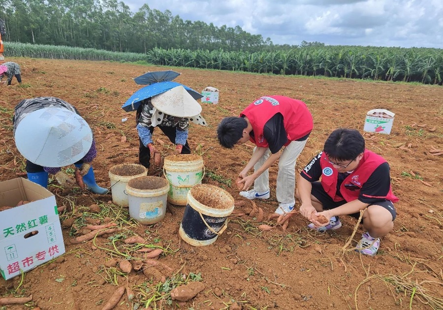 星火燎原社會實踐隊在村民的指導(dǎo)下,學(xué)習(xí)紅薯大小果的分揀和分類。在聊天中,他們結(jié)合村民的自身經(jīng)歷,了解到了紅薯產(chǎn)業(yè)帶動鄉(xiāng)村經(jīng)濟(jì)發(fā)展、促進(jìn)村民增收致富的故事。星火燎原社會實踐隊成員也將新媒體優(yōu)勢和自身特長相結(jié)合,參照“互聯(lián)網(wǎng)+助農(nóng)”模式,采用“故事講述+產(chǎn)品介紹”的方式,在田間地頭開展助農(nóng)直播活動2次,幫助合浦縣紅薯產(chǎn)業(yè)打破地域限制,樹立品牌形象,提升市場競爭力。據(jù)了解,此次直播總時長超3h,共計千余人觀看。農(nóng)民們紛紛表示,現(xiàn)代化設(shè)備的使用大大減輕了他們的負(fù)擔(dān),而學(xué)生們的幫助和新理念則讓他們對未來的農(nóng)業(yè)發(fā)展充滿信心。這種城鄉(xiāng)之間的互動,不僅為農(nóng)村注入了新鮮活力,也為學(xué)生們提供了寶貴的實踐經(jīng)驗。