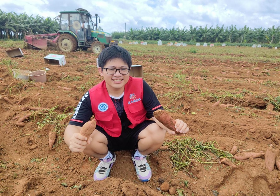 圖為實踐成員展示紅薯豐收喜悅,身后的機(jī)器體現(xiàn)科技力量   張莉萍 供圖